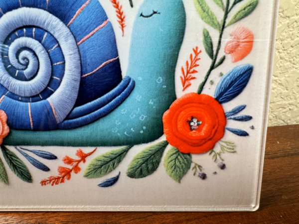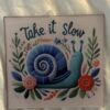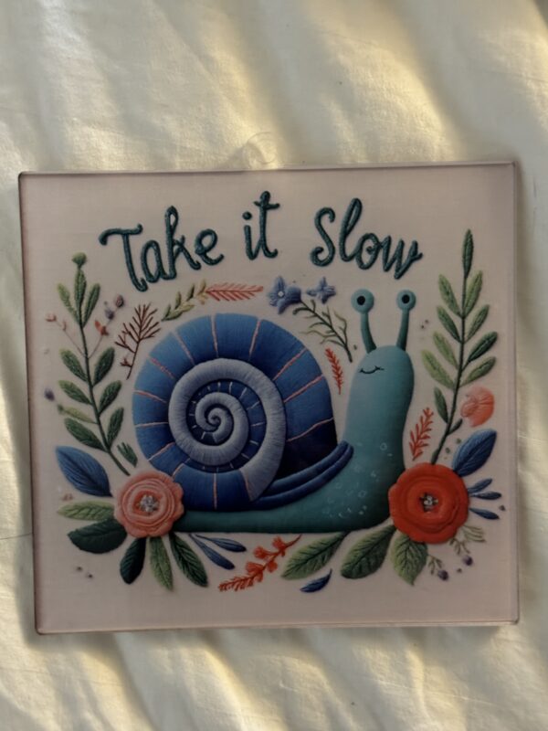 Acrylic “Take It Slow” Snail – Home Decor Vintage Stitch Style Trendy! This is an acrylic peice that is designed to look like embroidery or stitch! It was inspired by a popular crewel done in the 70s. It truly looks amazing! Thank you for checking it out
